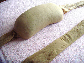 これを、両足先を切って繋げたストッキングにいれました。ちょうど真ん中位置でずれないように一か所だけ縫い止めて。これは角出しや、ぺたんこなお太鼓用の帯枕です。
